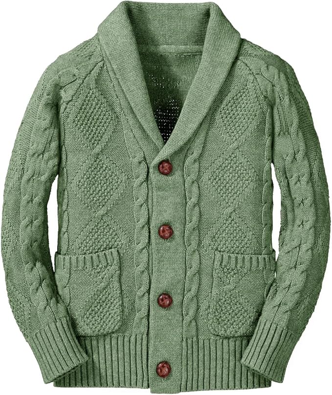 Boy's Sweater Cardigan Button Down Shawl Collar Cable Knitted Outwear Sweater Coats with Pockets