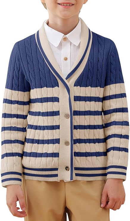 Boys Cardigan Striped Cable Knit Sweater Kids Casual Long Sleeve Shawl Collar Fall Clothes 4-14Y