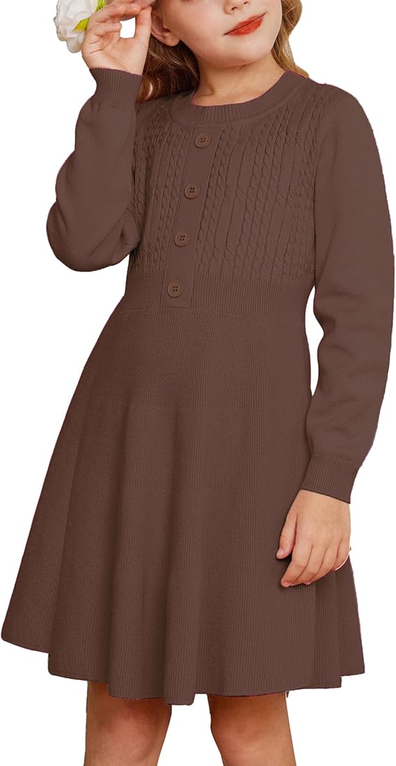 Girl Dress Long Sleeve Sweater Ruffle Button Front Knit Casual Fall Winter Dresses for Girls 5-12